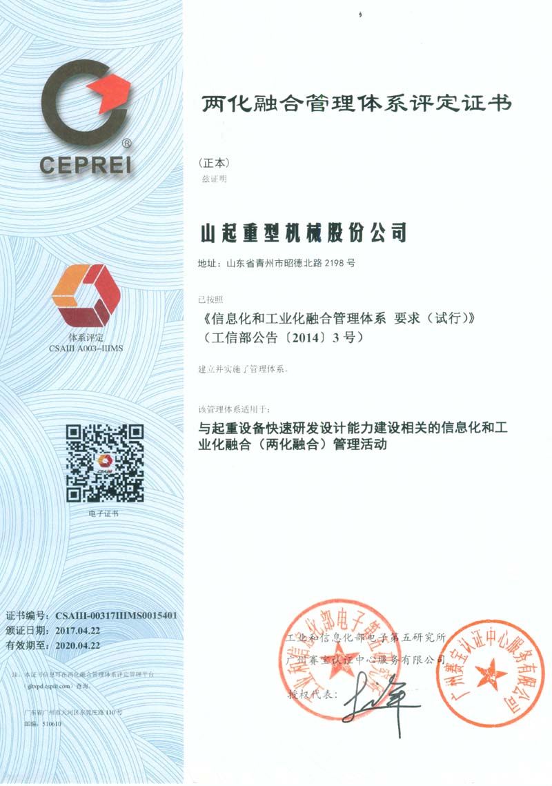 國家級兩化融合貫標(biāo)試點企業(yè)——山起重型機械股份公司,與起重設(shè)備快速研發(fā)設(shè)計能力相關(guān)的兩化融合管理活動,現(xiàn)已通過工信部審核并獲得證書。
