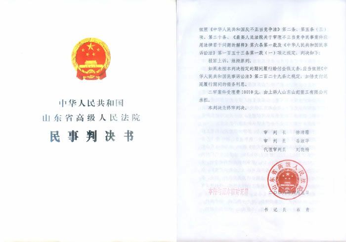 山起重工不服原審判決,提起上訴,請(qǐng)求撤銷原審判決并依法改判,理由為:1、原審判決認(rèn)定事實(shí)錯(cuò)誤。山東起重機(jī)廠作為一家普通的起重設(shè)備生產(chǎn)企業(yè),企業(yè)規(guī)模、營銷、信譽(yù)均處于同行業(yè)的一般水平,并非知名企業(yè)。并且山東起重機(jī)廠成立以來次變更企業(yè)名稱,1992年前使用的名稱是“益都縣起重機(jī)廠”、“青州起重機(jī)廠”,與所謂“山起”簡(jiǎn)稱沒有關(guān)系。山起重工使用“山起”字號(hào),在產(chǎn)品中標(biāo)注企業(yè)全稱,在宣傳材料上有拼音“SQZG”或“山起重工”標(biāo)識(shí),在住所中寫明青州市工業(yè)路1199號(hào);山東起重機(jī)廠的名稱中沒有字號(hào),產(chǎn)品中使用“駝山”商標(biāo),宣傳材料使用“SDCW”或“青州”等標(biāo)識(shí),住所是青州市青州南路1757號(hào)。兩企業(yè)在名稱、商標(biāo)、宣傳標(biāo)識(shí)、住所等能夠體現(xiàn)區(qū)別,公眾易于識(shí)別,對(duì)此山東山起重工提供了全國范圍內(nèi)17個(gè)企業(yè)的證明材料。2、原審判決適用法律不當(dāng)。根據(jù)《企業(yè)名稱登記管理規(guī)定》,企業(yè)只能使用一個(gè)名稱,只有經(jīng)過依法核準(zhǔn)登記的名稱方受法律保護(hù)企業(yè)對(duì)外交往的名稱必須與登記注冊(cè)的名稱一致,不允許使用簡(jiǎn)稱。因此,山東起重機(jī)廠未經(jīng)核準(zhǔn)注冊(cè)的所謂“山起”簡(jiǎn)稱主張權(quán)利沒有法律依據(jù),原審判決將企業(yè)簡(jiǎn)稱納入法律保護(hù)范圍的論點(diǎn)不能成立。山起重工不存在不正當(dāng)競(jìng)爭(zhēng)行為,原審法院判決山起重工賠償20萬元沒有事實(shí)、法律依據(jù)。